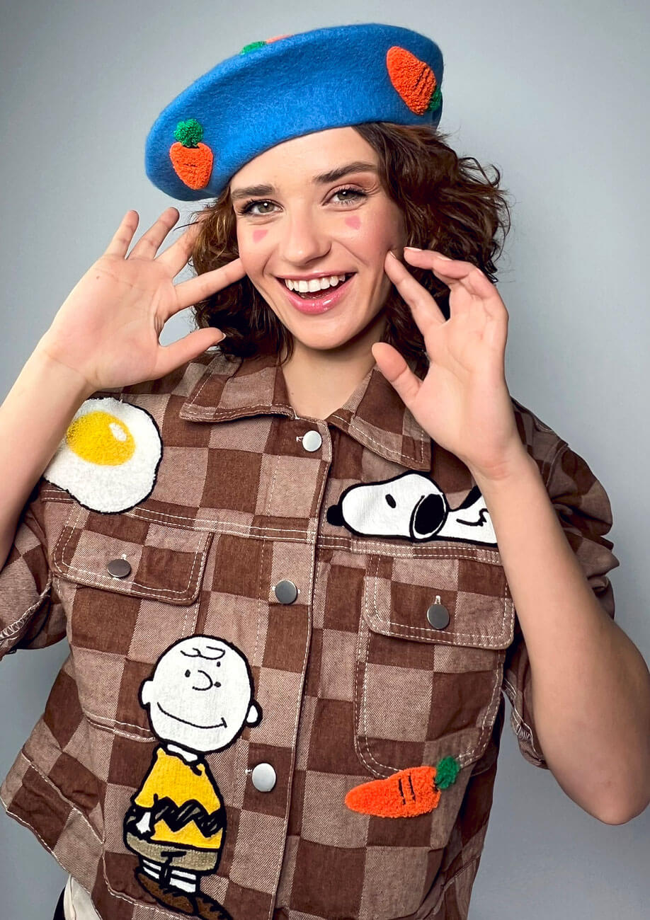 Artystyczna kurtka z pięknego jeansu w kratę. Zapinana na guziki. Krój klasyczny z szerokimi rękawami. Kieszenie na piersiach. Ozdobiona haftowanymi aplikacjami w radosnej retro estetyce. Duża cekinowa aplikacja również z tyłu. Utrzymana w beżowo – brązowej kolorystyce. UNIKAT.